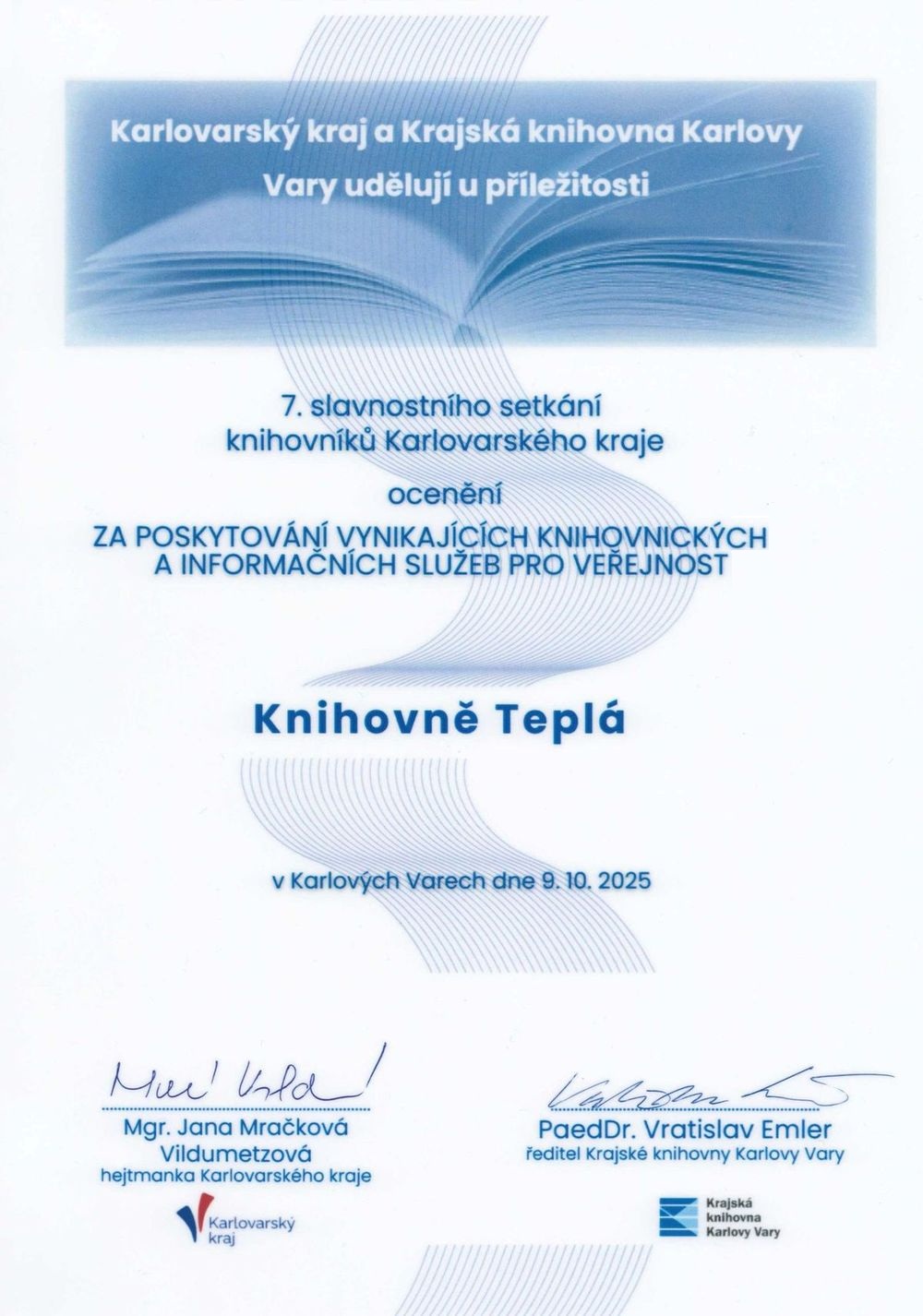 Naše knihovna získala ocenění v rámci 7. slavnostního setkání knihovníků Karlovarského kraje!!!